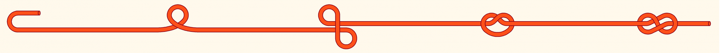 Ausgehend vom geraden Seil werden durch schrittweises Hinzufügen von Seil-Kreuzungs-Punkten 7 grundlegende Basisknoten beschrieben. Hinzu kommen 3 elementare